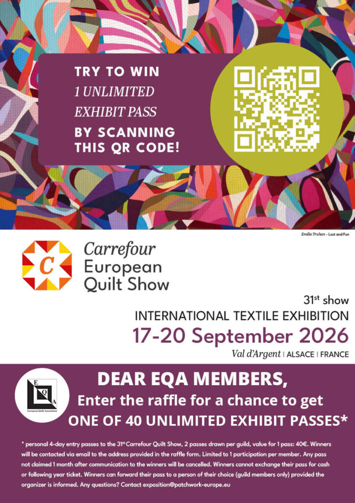 EQA (European Quilt Association) býður félagsmönnum sínum að taka þátt í happdrætti þar sem dregnir verða út 40 ókeypis sýningarmiðar (unlimited exhibit pass) á Carrefour European Quilt Show 2026 í Frakklandi.